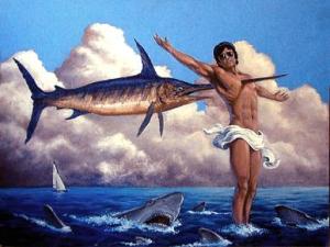 A creepy dying mounted swordfish; with a pupil that follows every movement Roger makes, starts flopping about with its living dead, creepy eye following, stuck on a plank body.